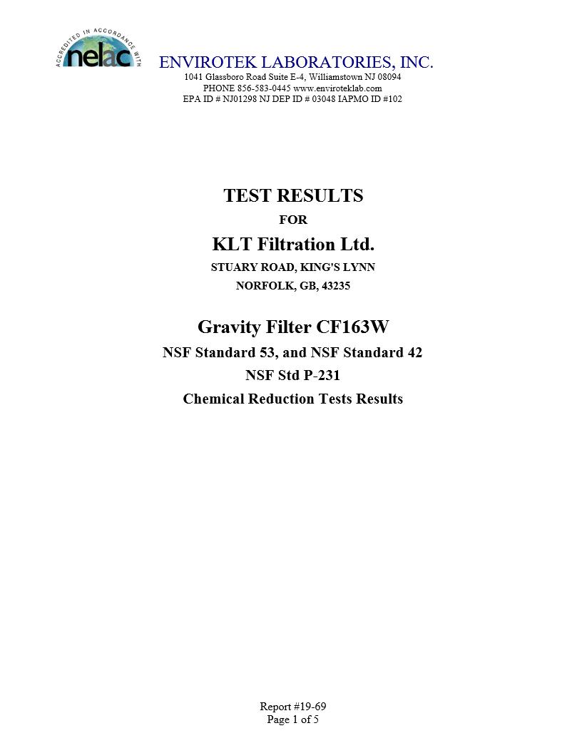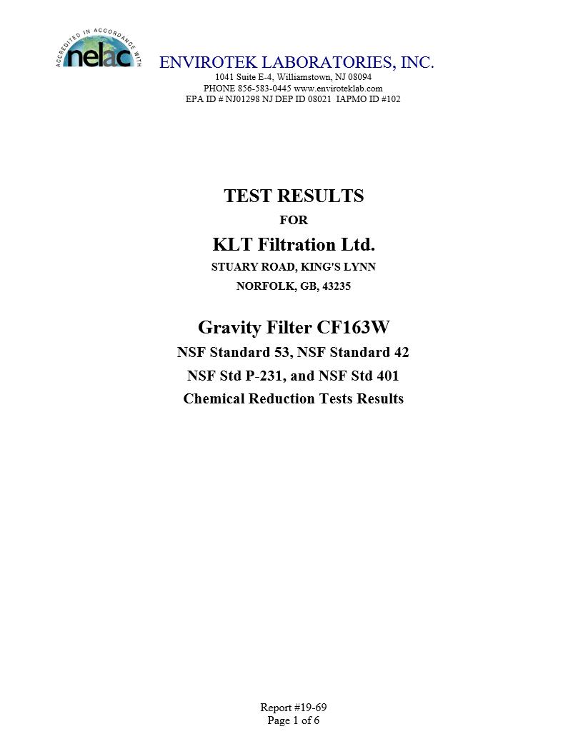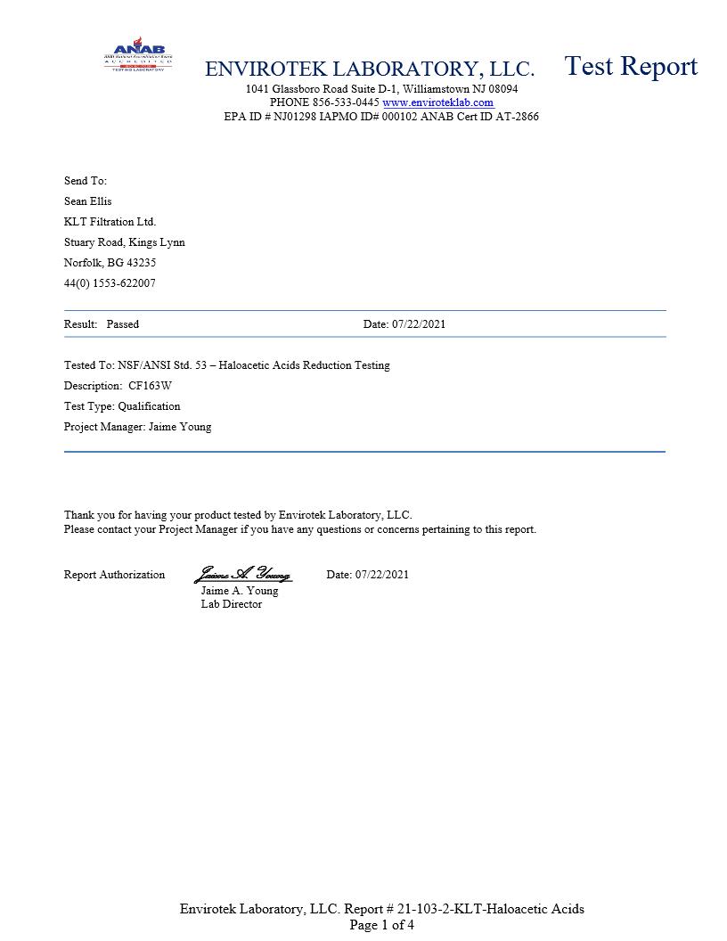 Die Tests werden gemäß den NSF/ANSI-Normen 42, 53 und P231 von Envirotek Inc, New Jersey, USA, EPA-ID-Nr. NJ01298 NJ, durchgeführt.